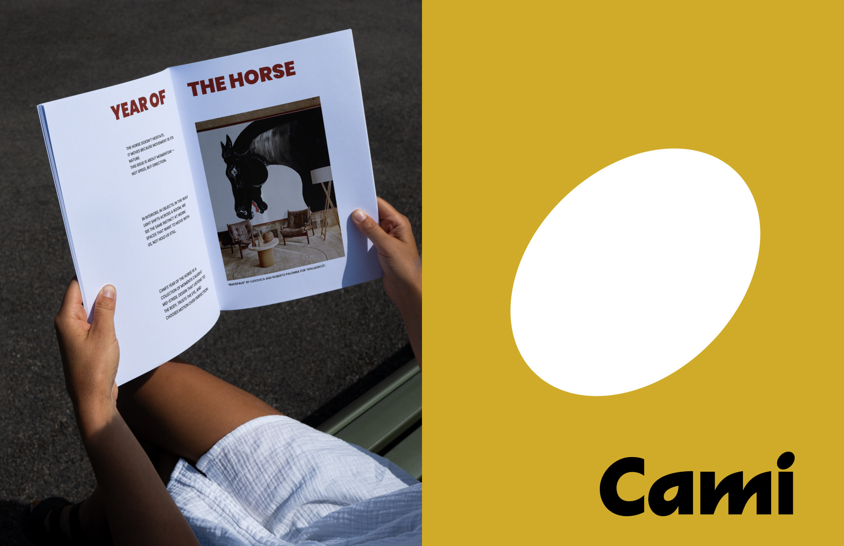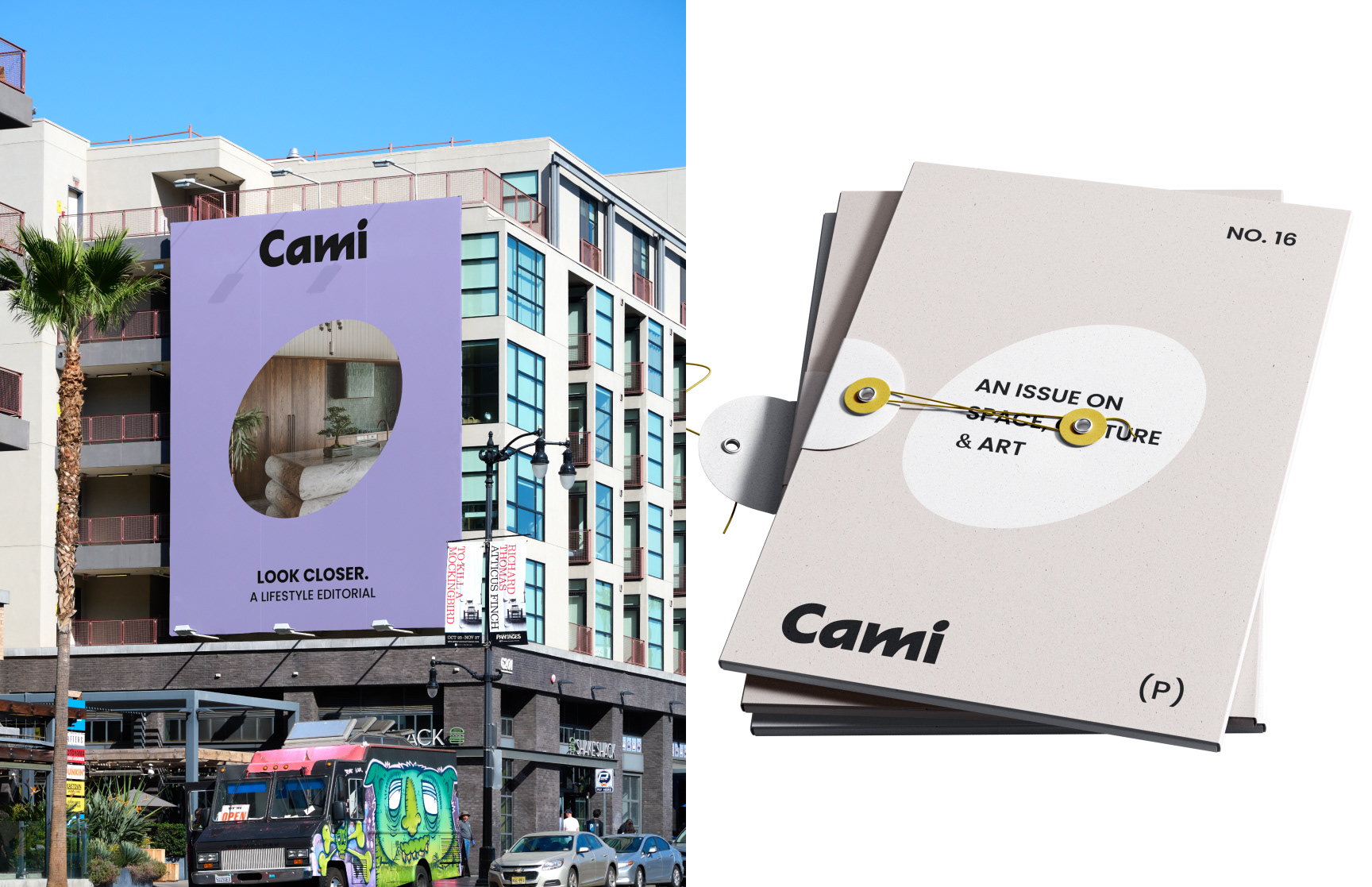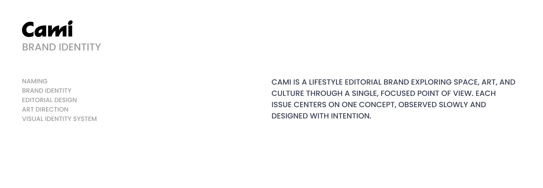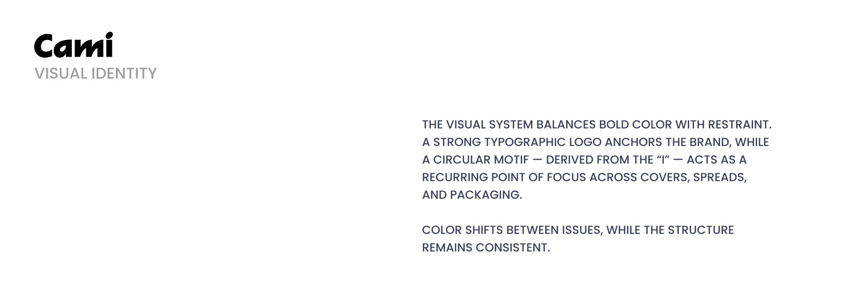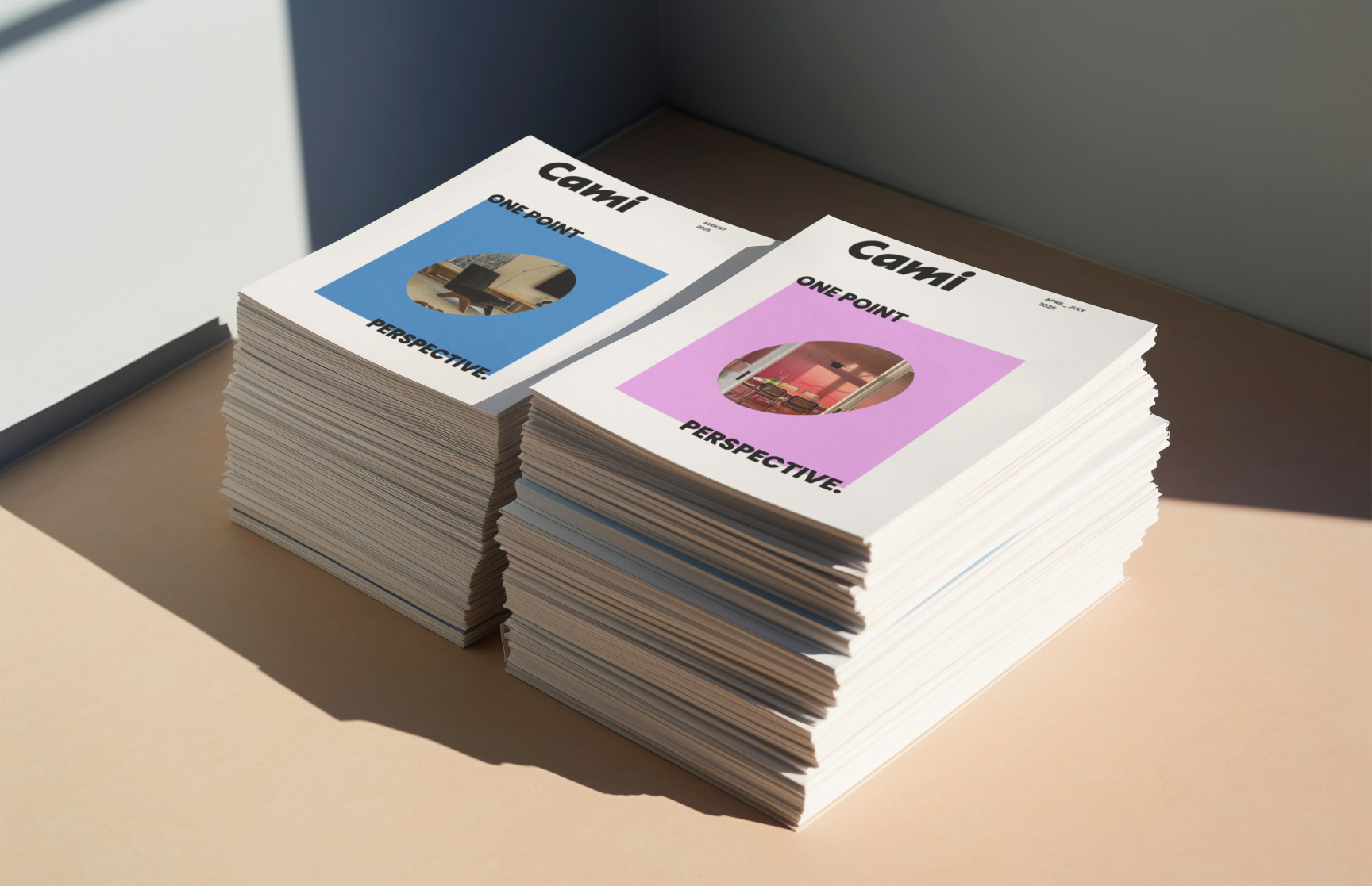 Cami is a conceptual editorial magazine built around perspective. Each issue focuses on one idea, translated through intentional layouts, controlled color, and a calm yet bold visual language that treats space as part of the content.