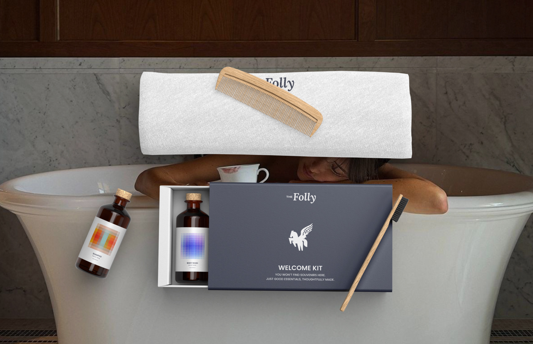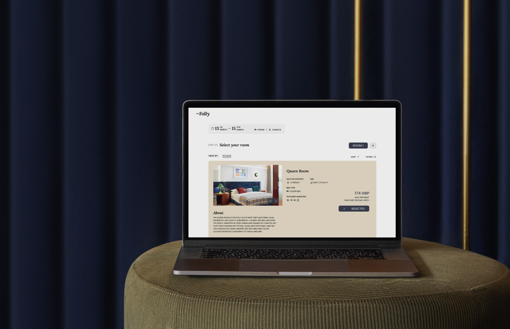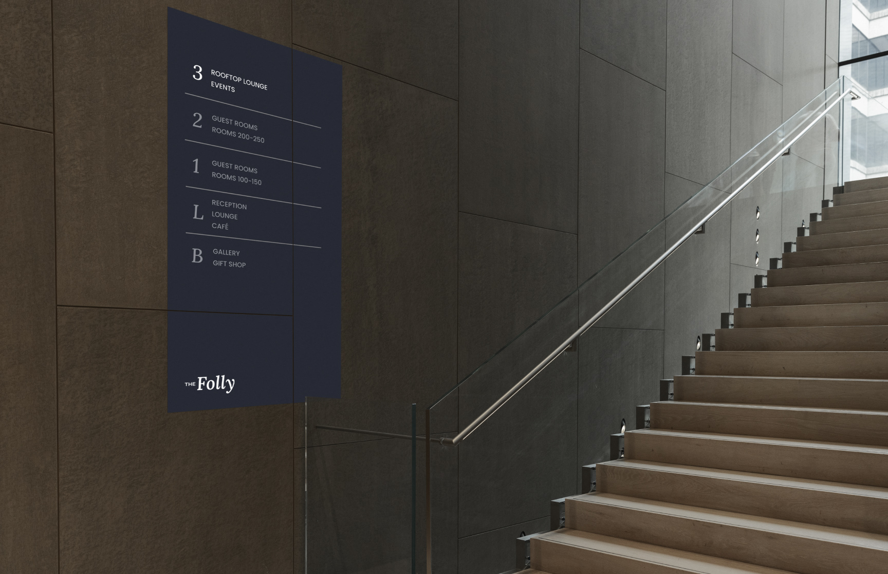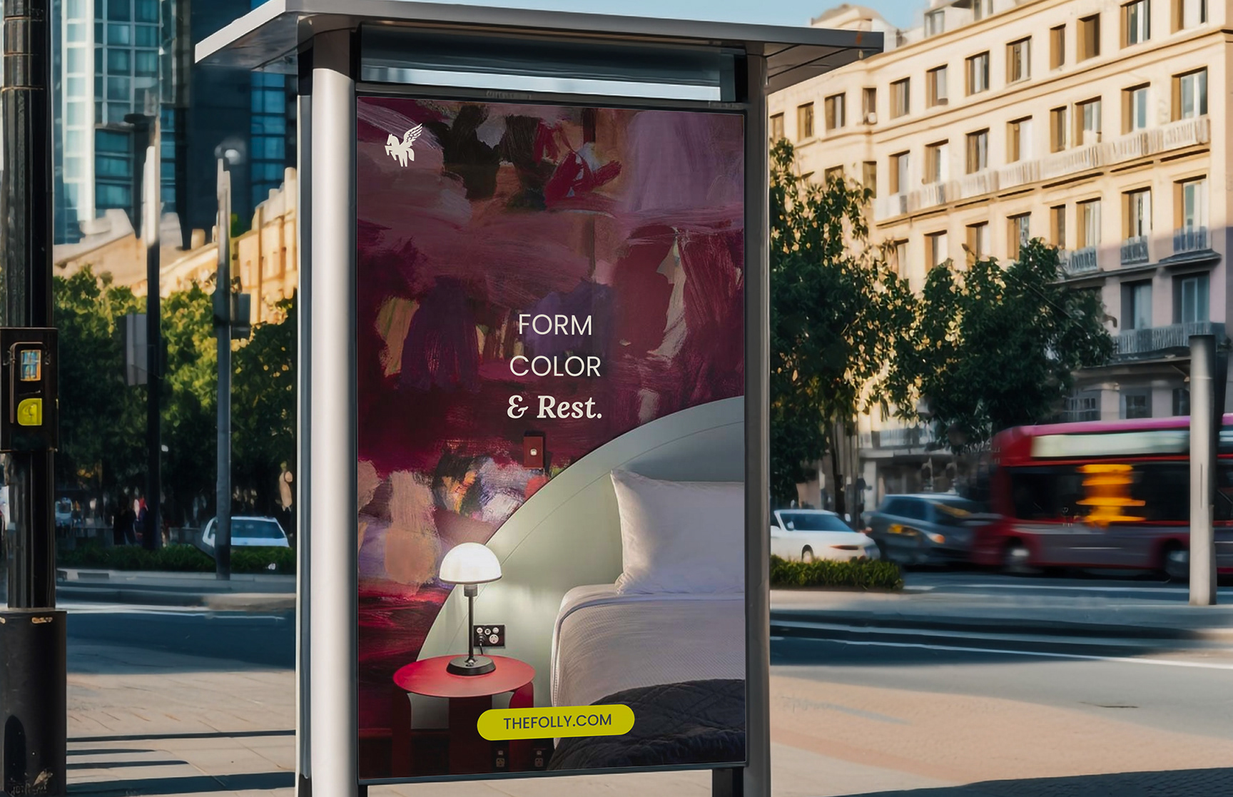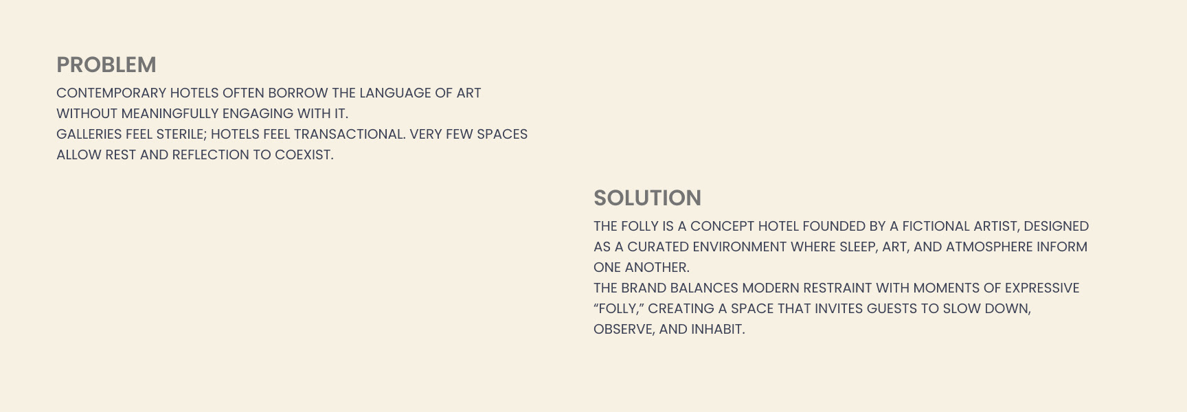 The Folly is a conceptual hotel and gallery where modern restraint meets curated artistic excess. Framed as the vision of a fictional artist-founder, it treats hospitality and exhibition as one continuous creative act.